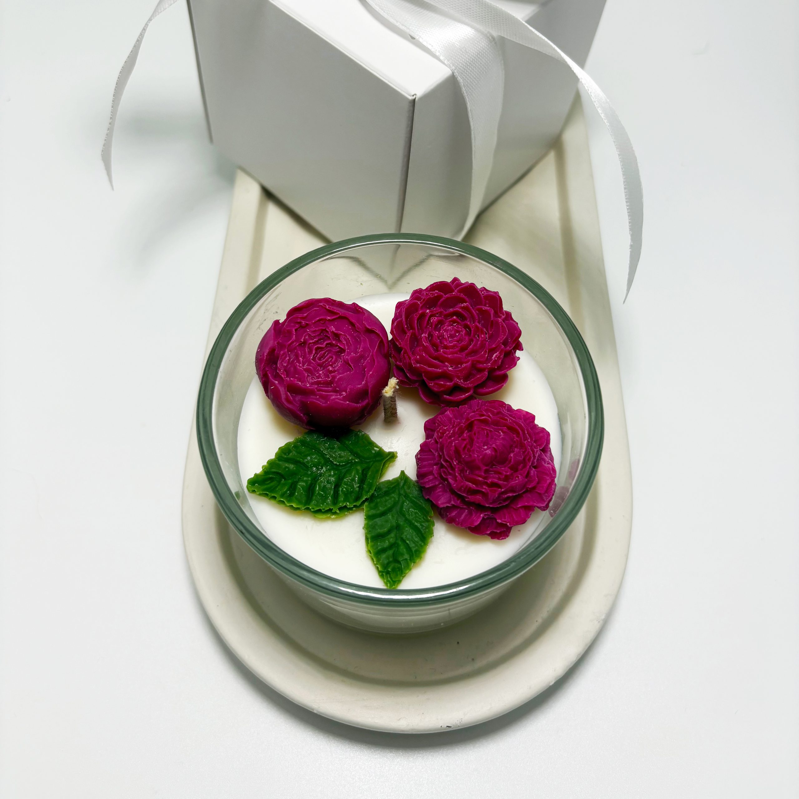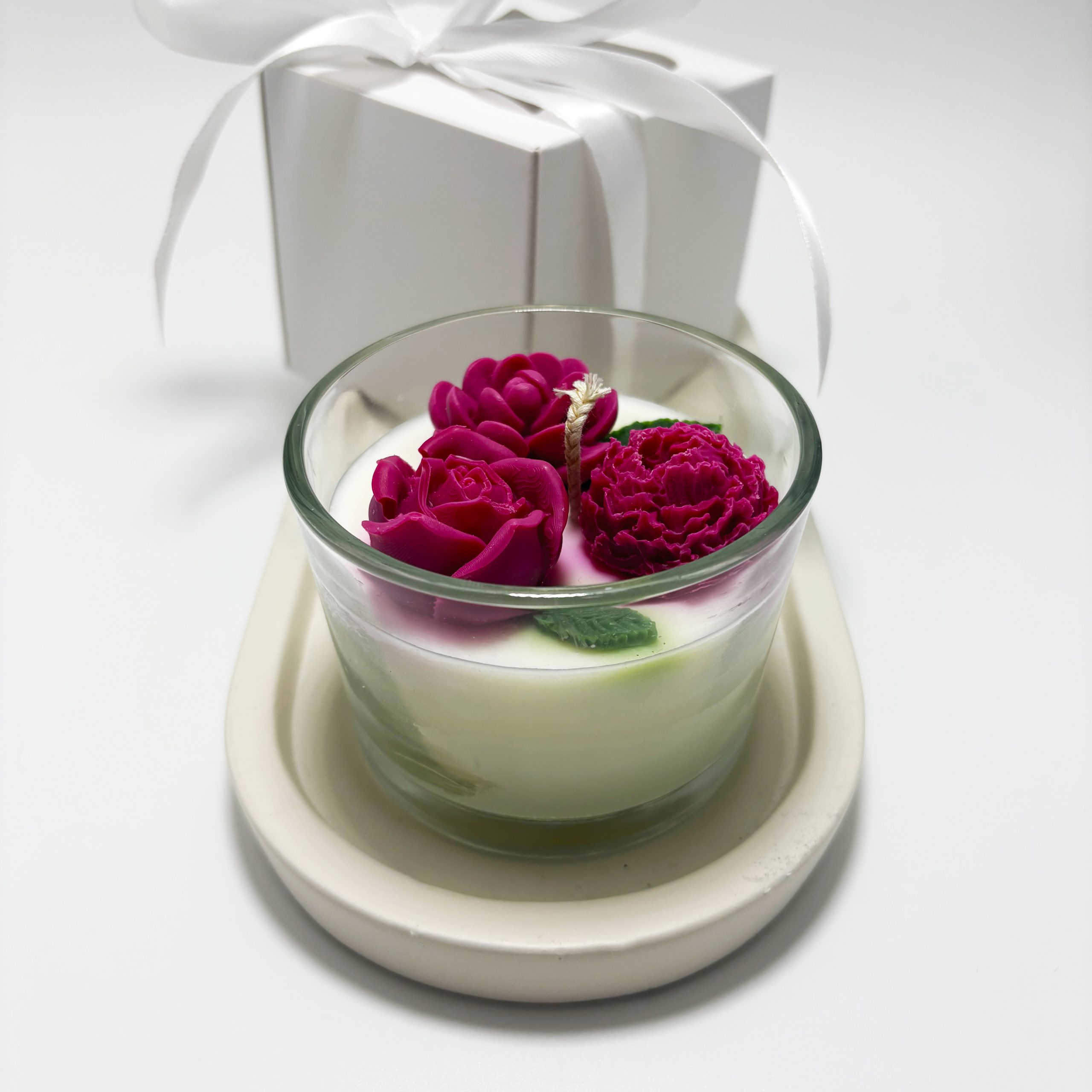 Lumânare parfumată cu o compoziție florală elegantă, turnată într-un recipient din sticlă. Designul rafinat completează perfect orice decor și creează o atmosferă caldă și relaxantă.